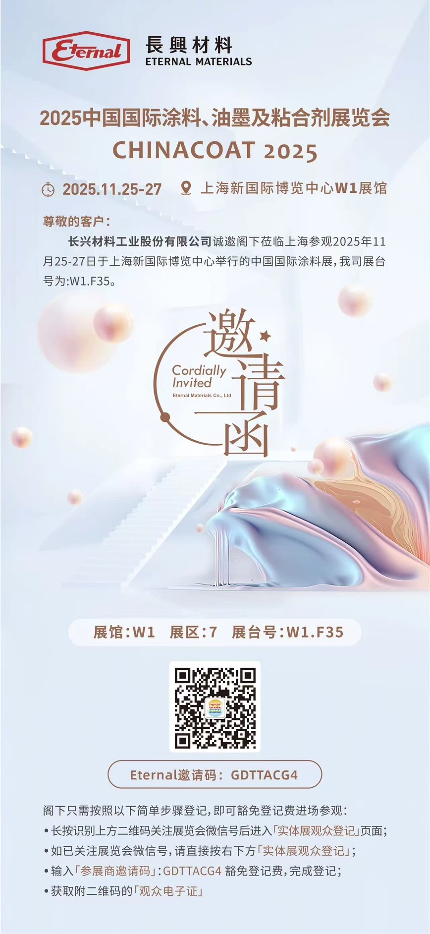 Eternal Corporation will participate in the CHINACOAT China International Coatings Exhibition held at the Shanghai New International Expo Center from November 25 to November 27, 2025 to promote the company's organic UV resins and UV dye materials, and widely evaluate UV coatings, UV inks and UV adhesives. The exhibition will focus on introducing glass application solutions, 3D light-curing printing materials, special customized agents, dual-cure adhesive materials, EB curing solutions, excimer skin-feel materials, etc. We sincerely invite come to discuss and exchange ideas and seek common future development.